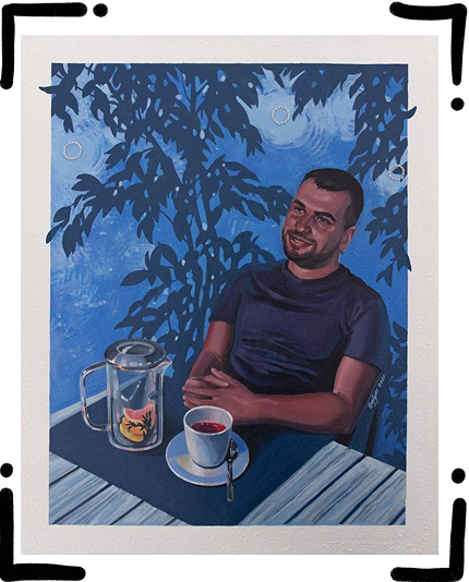 Later, I transferred this tactile approach to portraits. For example, I had a ‘tea-and-coffee’ project about domestic intimacy, where I depicted people with a cup of tea, and in the background were their personal belongings – special mugs, teapots. I added my own tactile detail to each portrait: little stars that glint differently, or a texture related to the person’s habits.